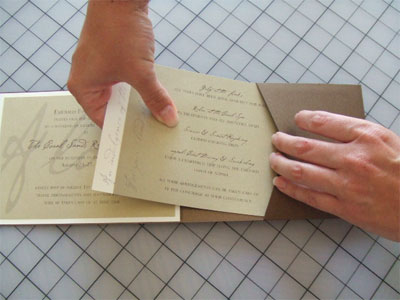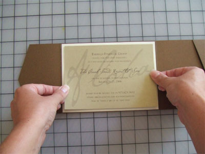Step 1: Gather your supplies These are the paper layers needed to complete this invitation - we can print these for you or you can purchase the blank cards to print yourself. Our sample invitation consists of: 1. bronze 5x7 Pocket Fold® (signature portrait)